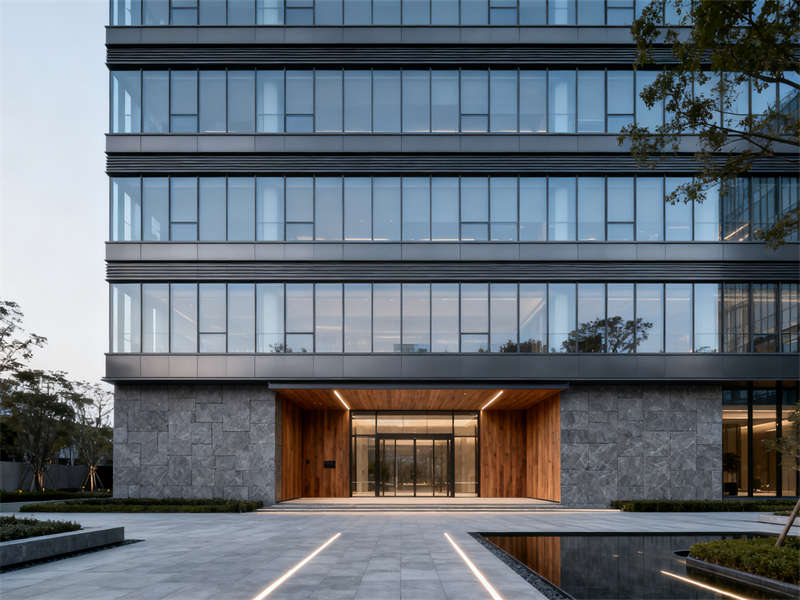 開放辦公區以通透協作為設計重點,半透明磨砂玻璃隔板兼顧隱私與互動,木色桌面與深灰金屬支架結合,延續整體材質基調,搭配簡約照明,營造專注且不壓抑的工作氛圍。獨立辦公室劃分出辦公與接待區域,木飾面背景墻搭配淺灰布藝沙發,在保持商務感的同時,增添柔和質感,滿足私密溝通需求。