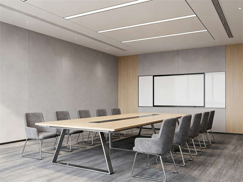 中型會議室圍繞協作功能展開,長條式會議桌與玻璃隔斷搭配,既保證空間開闊,又能與外部辦公區形成視覺聯動,灰色布藝座椅與頂部圓形吊燈呼應,讓會議場景兼具功能性與舒適感。茶水間則通過淺灰石英石臺面、木色護墻板與暖光燈帶,營造輕松休閑的氛圍,成為辦公間隙的放松節點。