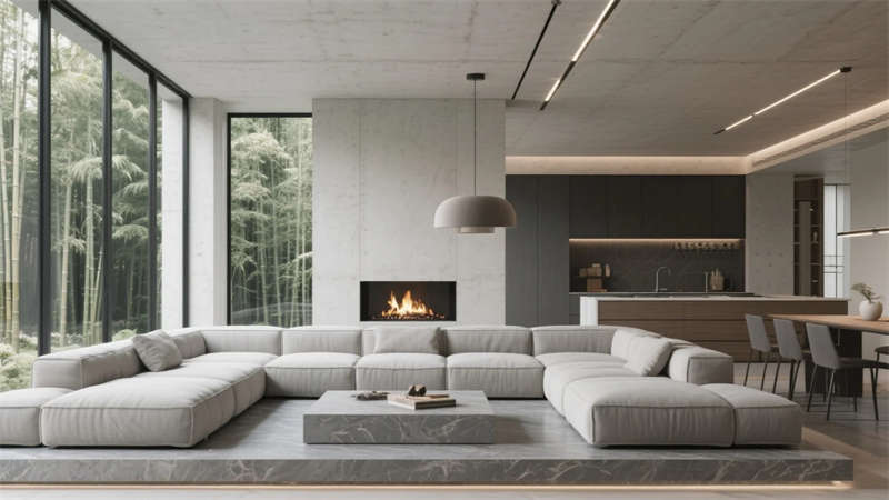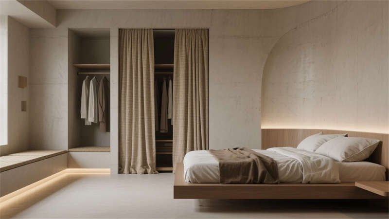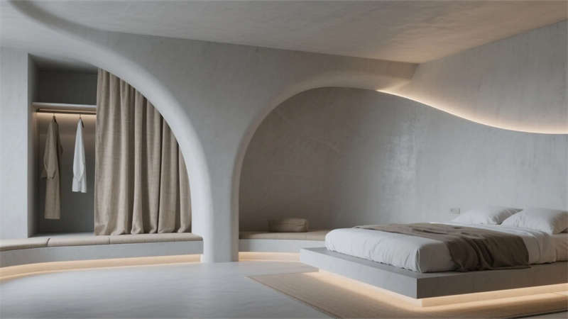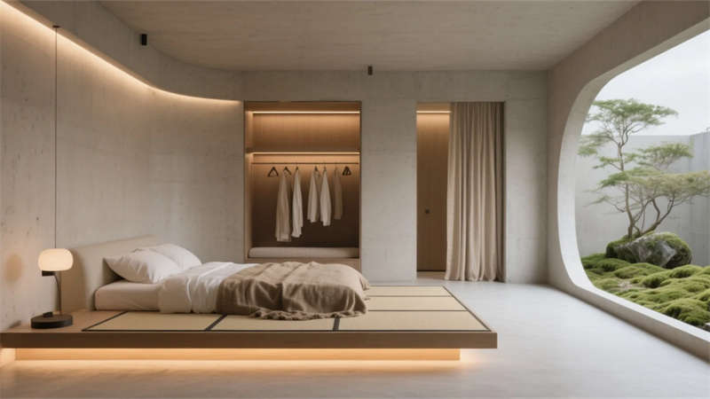 衛浴空間化身立體水景容器,鏡面天花反射青石浴缸與垂吊綠植,形成虛實交織的自然劇場。所有構件皆服務于居者與環境的對話,混凝土墻體在晨昏光線中呈現不同肌理,定制家具的圓弧收邊柔化現代主義的冷冽。