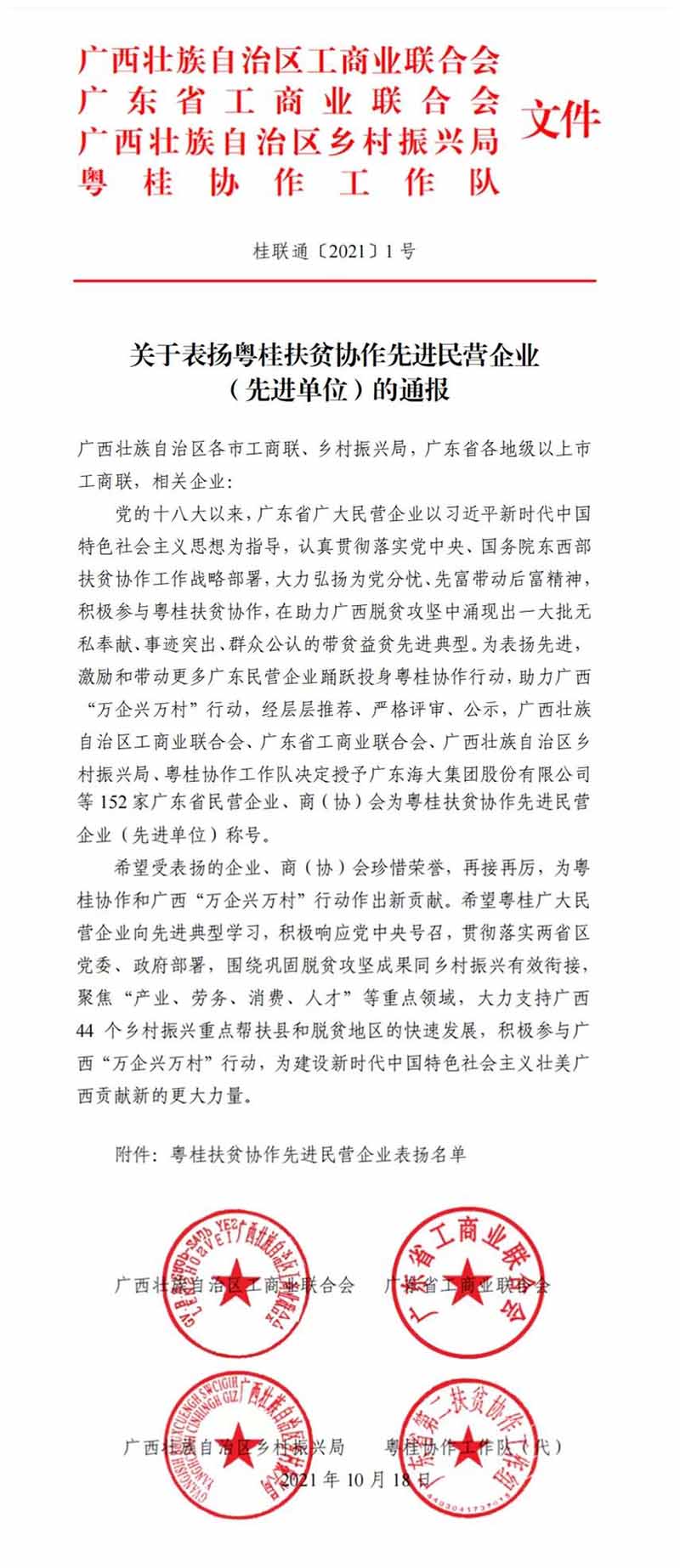 我司與其他151家企業(yè)、商協(xié)會被評為“粵桂扶貧協(xié)作先進民營企業(yè)(先進單位)”。