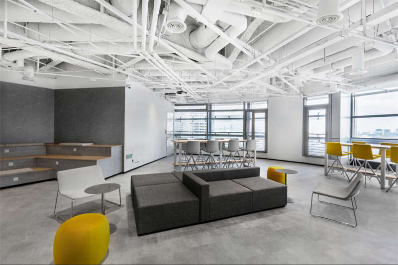 以方塊切割空間,幾何造型的演變、堆疊,創建出矩陣空間的實體形態。白色,灰色,明黃充斥,隨意散落在空間中,看似不經意的堆砌,卻是空間中不可忽視的點綴。