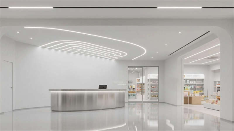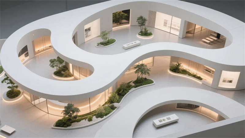 展廳內(nèi)劃分智能產(chǎn)品互動區(qū)、家居場景模擬角及環(huán)保材料廊道,通過觸摸屏、生活化場景等設(shè)計,直觀展示產(chǎn)品功能與使用情境。細(xì)節(jié)處融入抽象寵物藝術(shù)裝置與苔蘚微景觀,平衡科技感與自然溫度。空間材質(zhì)強(qiáng)調(diào)啞光與反光對比,燈光層次突出產(chǎn)品質(zhì)感,既滿足品牌展示的專業(yè)性,又賦予訪客溫馨如家的氛圍。